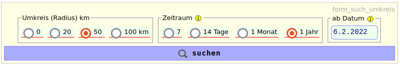 Die Ortskalender Programm p591b „Öfftl. Liste Veranstaltungen“ enthalten auch Termine von Nachbarorten und Stadtteilen, deren Mittelpunkte bis zu 20km Luftlinie vom Mittelpunkt des gewählten Ortes entfernt sind. Der Umkreis kann vom Leser im Ortskalender-Formular form_such_umkreis geändert werden. Als Ort ist eine Kombination aus Postcode und Ortname zu verstehen, die in der Ortstabelle mit Koordinaten gespeichert ist. Ortskalender werden aufgerufen durch Klick auf einen Ortsnamen in Listen und anderen Kalendern.